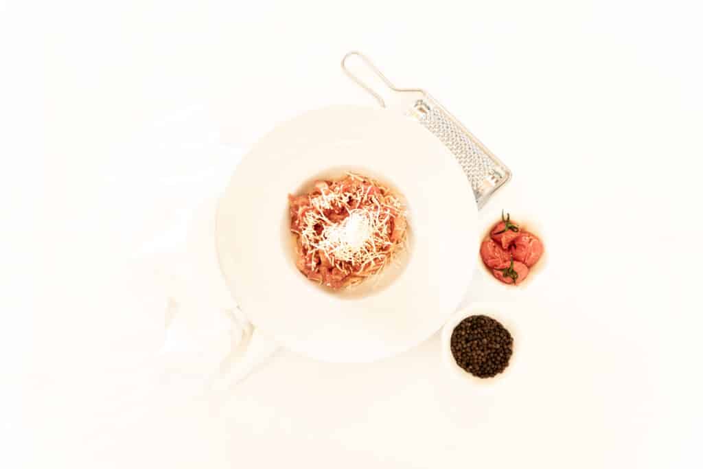 Si dice che l’amatriciana sia nata ad Amatrice e che fosse il pasto principale dei pastori, anche se originariamente era senza pomodoro e prendeva il nome di “gricia” (piatto di spaghetti o maccheroni conditi con olio, pepe e guanciale). Il pomodoro fu aggiunto in seguito, quando venne importato dalle Americhe e il condimento prese il nome, appunto, di “amatriciana”.