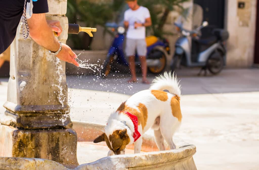 The dog is drinking from the fountain in Piazza Mercantille. Scenes from the life of Bari Vecchia on a sunny summer day, Puglia